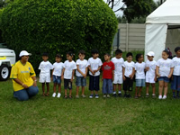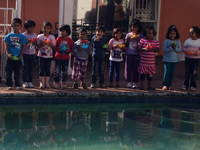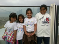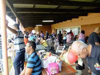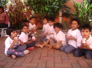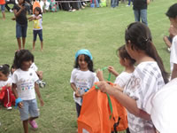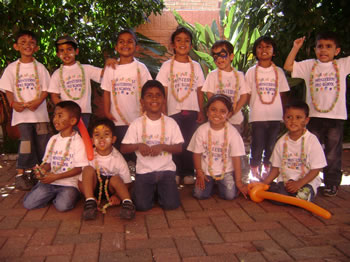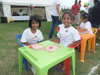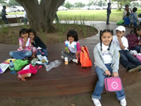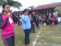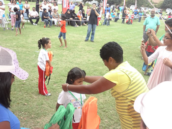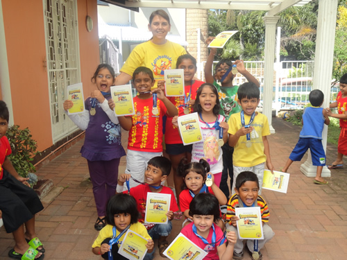 The middle group proudly wearing the necklaces they threaded with 100 fruit – loops